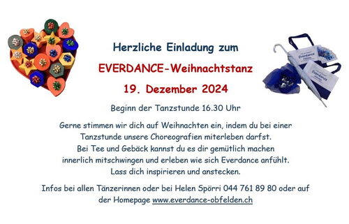 Ab Dezember 2023 können wir wieder wie gewohnt im Brunnmattsaal tanzen und unsere Everdance-Stunden ohne Kollisionen geniessen. Zu adventlicher Musik lassen wir uns auf die Vorweihnachtszeit einstimmen. Freuen wir uns auf frohe und beschwingte Tanzstunden. Neue Tänzer/innen sind jederzeit herzlich Willkommen.